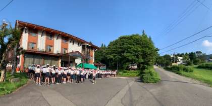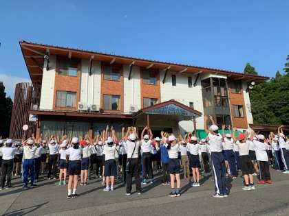 朝のつどいに子どもたちが集まってきました。ハチ高原は快晴。気持ちの良い青空が広がっています。