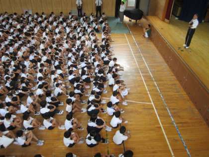 校長先生や生活指導担当の先生から楽しい夏休みを過ごすために「交通ルールを守る」「子どもだけで遠出しない」「知らない人についていかない」などの話がありました。