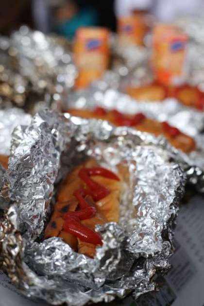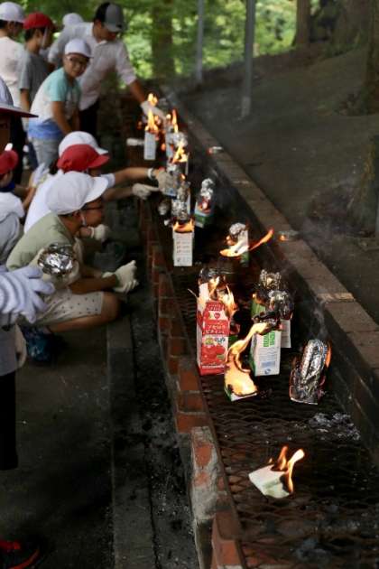 昼食はカートンドッグです。ホットドッグをアルミホイルで包み、牛乳パックに入れて点火します。