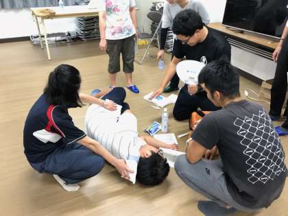そこで、友渕小学校でも、児童が熱中症になった時の対応の方法を学ぶ場を持ちました。お話を聞いた後、実際に誰かが倒れてしまったときのロールプレイも行ないました。どの教員も集中し、疑問に思ったことはすぐに聞いてメモに取りました。