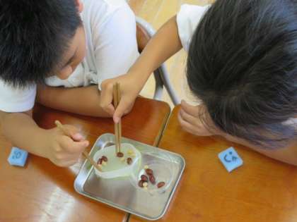 子どもたちは、正しい箸の持ち方を教えてもらった後、「スポンジ」・「大豆」・「うずらまめ」などを実際につかむ練習をしました。