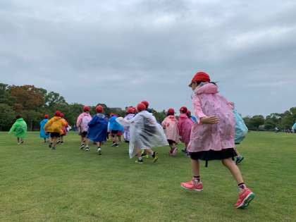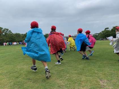 子どもたちは広大な芝生広場をダッシュします。薄曇りの空模様ですが、子どもたちは元気いっぱいです。