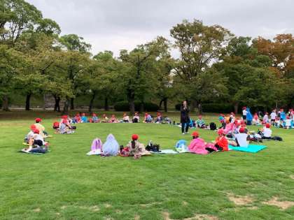 オリエンテーリングを終え、クラス毎に分かれて今からお弁当を食べます。