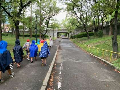 電車を降りて、大川沿いを歩いています。