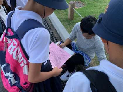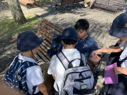 オリエンテーリングが始まりました。子どもたちはグループで各ポイントを回り、シールを手に入れていきます。