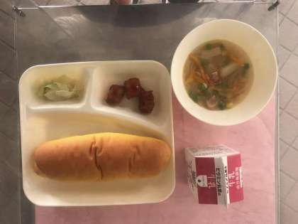 今日の給食は、パン・マグロのオーロラ煮・キャベツのゆずドレッシング・ベーコンとジャガイモのスープ・牛乳です。