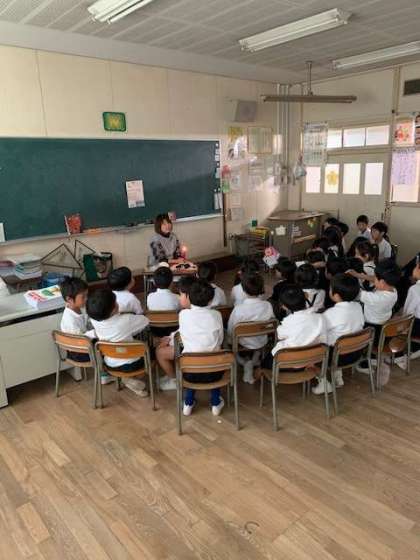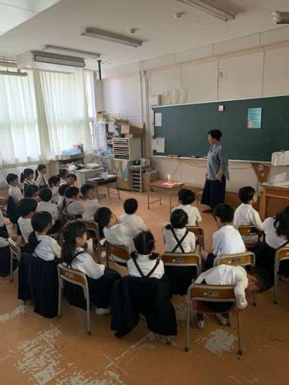 都島おはなしサークルの方が、13名も来ていただき子どもたちにお話をしてくださいました。ろうそくを立てて、教室を少し暗くして、お話を聴く子どもたちは、みるみるうちにお話に引き込まれていきました。