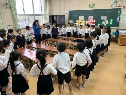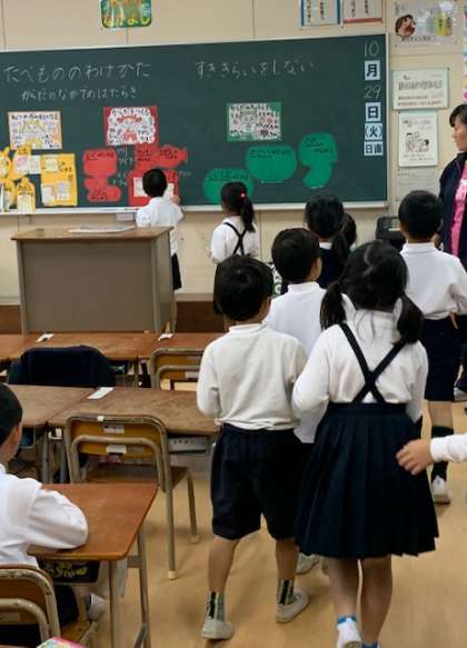 1年生は、栄養教諭による栄養学習をしました。食べ物をバランス良く食べる学習です。