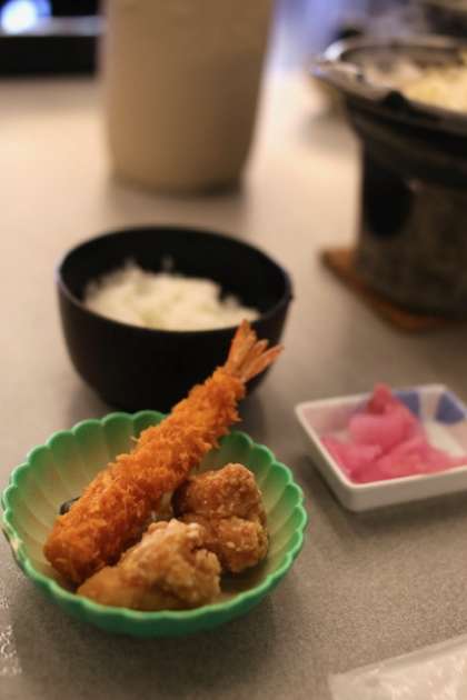 昼食はごはん、漬物、豚肉の鍋、唐揚げ、エビフライです。