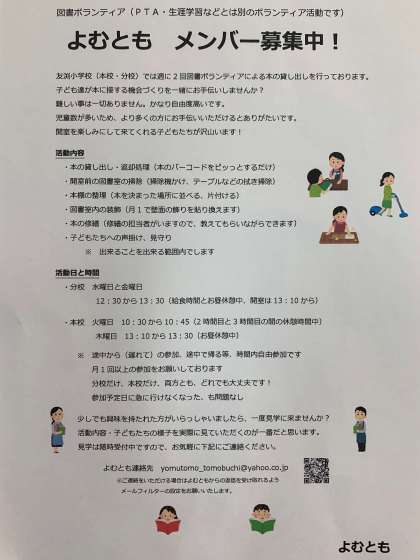 友渕小学校(本校・分校)では、週に2回図書ボランティアによる本の貸し出しを行っております。