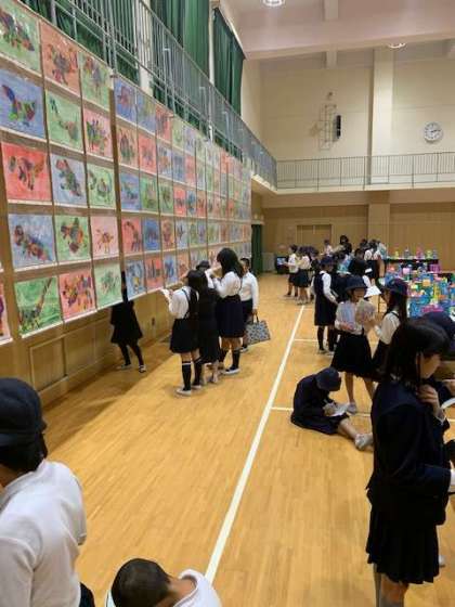 今日は5年生が、作品展の鑑賞に分校に来ました。一つずつの作品をじっくりと見ながら、どこがどのようにいいのかを学習しました。