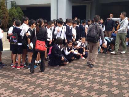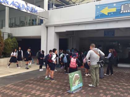 鳥羽水族館の前で記念の学級写真を撮ってから、各グループごとに水族館の中を見学します。
