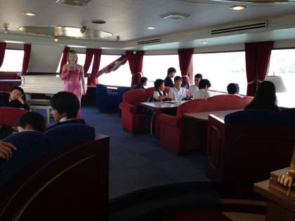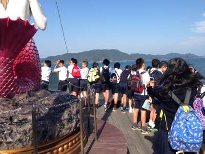 鳥羽からイルカ島に向かって船に乗りました。船内でくつろいだり、甲板から見える鳥羽湾のきれいな景色を眺めたりしています。