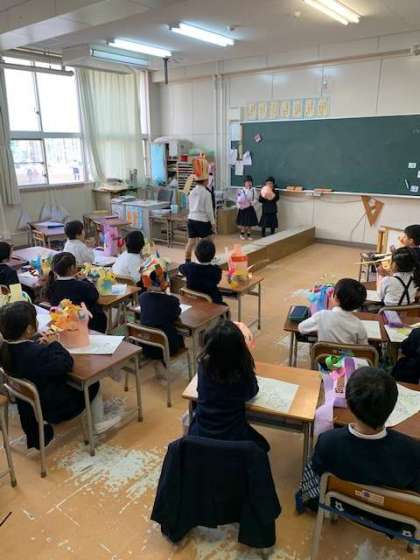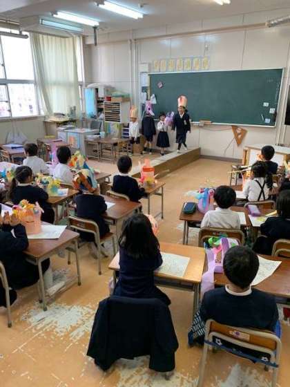 あるクラスでは、図画工作科でつくった帽子をみんなで鑑賞します。