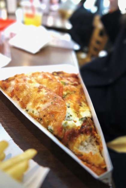 子どもたちは、アトラクションの合間にお昼を食べ始めています。ピザは毎年大人気のメニューです。