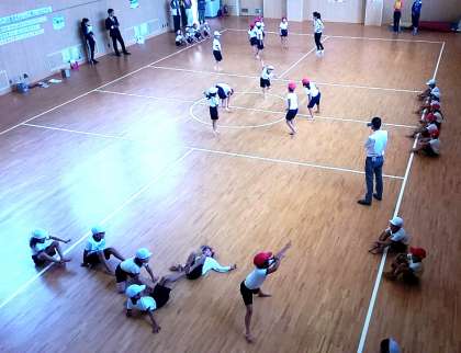 今日の2年5組の体育の学習は、「友渕忍者 参上!」というテーマです。子どもたちは、自分たち考えたお話にそって、忍者の様子や特徴をとらえた踊りを友だちと協力して工夫し、全身を使って楽しく踊っていました。