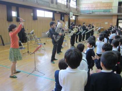 演奏の合間には、子どもたちがよく知っているアニメソングを演奏しながら、それぞれの楽器の紹介をしていました。身をのりだして楽器の音色を聴き入っている子どもも、いました。