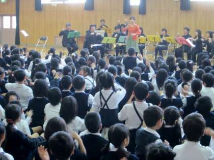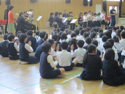 音楽鑑賞会は、本校の講堂で、午前中に低学年と高学年、午後から中学年と、三つのグループで、各学年に応じた音楽内容でおこなわれました。