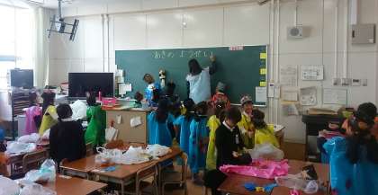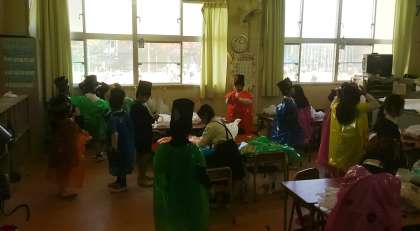 昨日に引き続きの秋フェスタ。今日は、5〜8組です。みんな楽しそうにファッションショーの準備をしています。