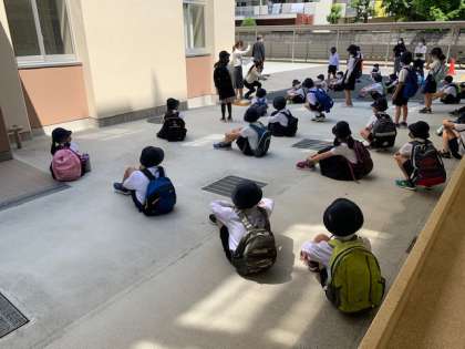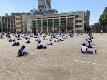 登校後は、運動場に間隔を開けて並び、最初に校長講話を聞きました。その後、各学級に分かれ、影になっている場所で配布物の受け取りと今後の予定についての連絡を聞きました。