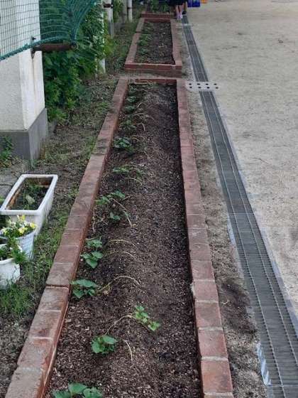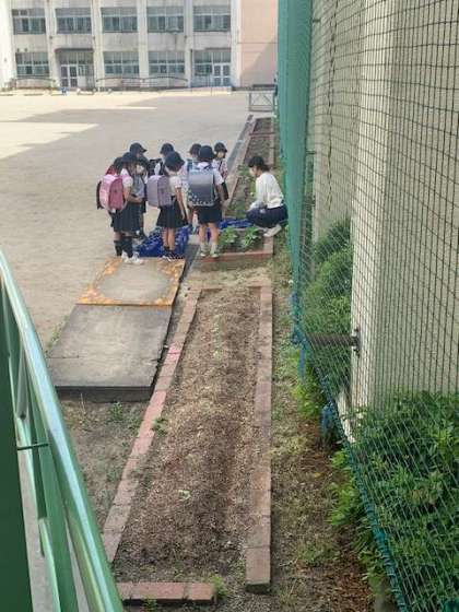 2年生は、かぼちゃ、さつまいも、とまと、おくら、なすび、えだまめ、きゅうりを植えています。