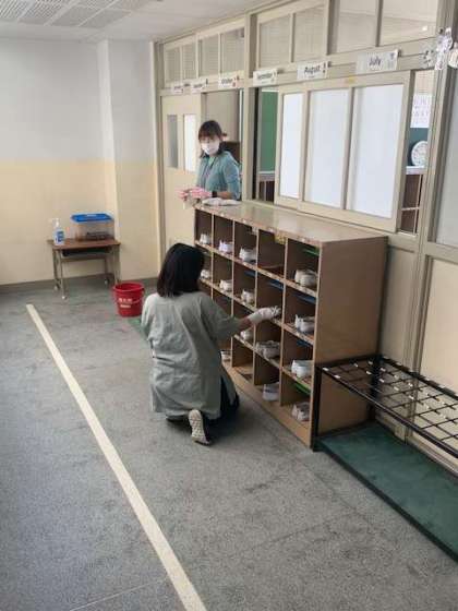 子どもたちが、帰ったあとは消毒作業です。出勤している職員が、総出で作業に取りかかります。