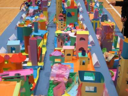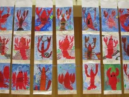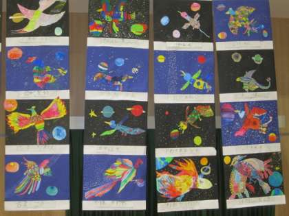 2年生は「はばたけ!うちゅうへ」「わくわくともぶちタウン」「ザリガニ」の作品を展示しています。