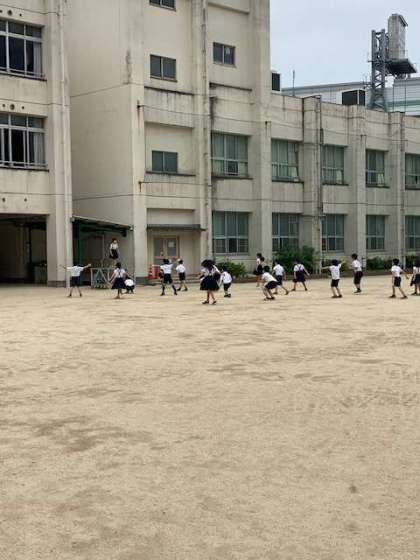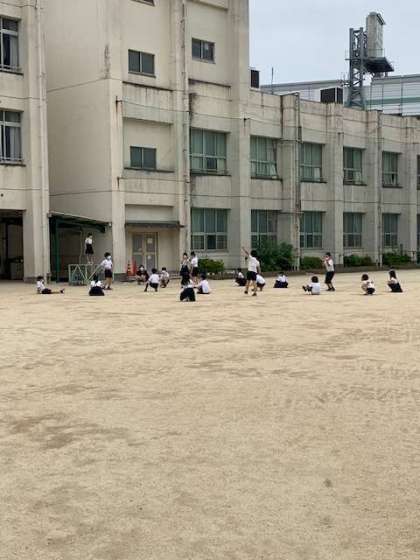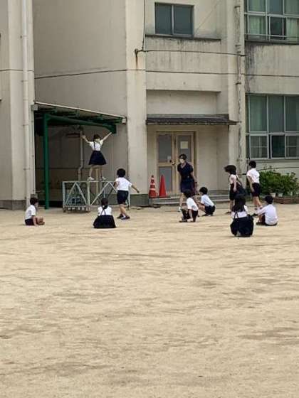 少しの休み時間ですが、運動場で全身を使ったジャンケンです。2メートルの間隔を空けて並んで、朝会台の上のお友だちと対戦です。