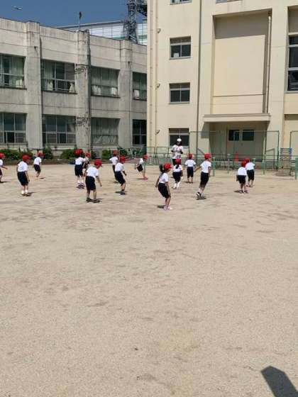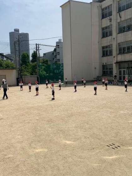 1年生は初めて、体操服に着替えて屋外に出ました。自分の着替えを管理し、机の上に置きます。こういったことも1年生にとっては初めての経験です。