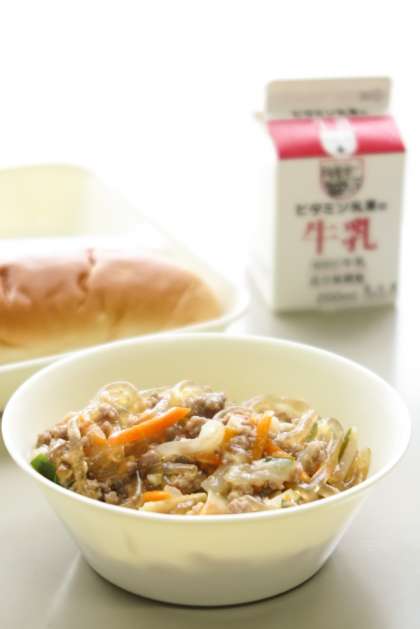 今日の献立は、「パン」、「牛乳」、「マーボー春雨」です。