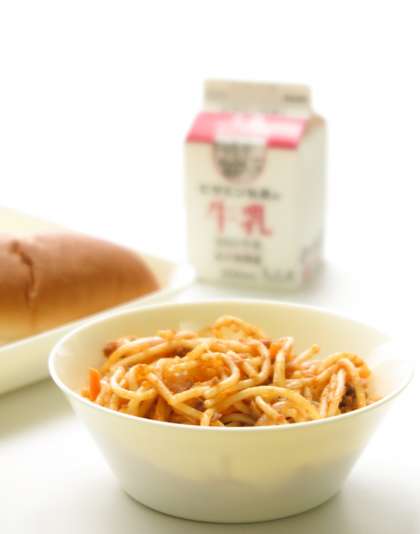 今日の給食は、牛乳、パン、スパゲッティです。