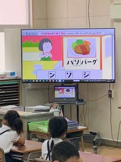 動画で確認をしました。ひらがなで「おつり」と「おしり」は、全然違うことはわかるのですが、カタカナではよく似ていて、大きな間違いになります。子どもたちは、笑いながらも気をつけないといけないと意識をしていました。