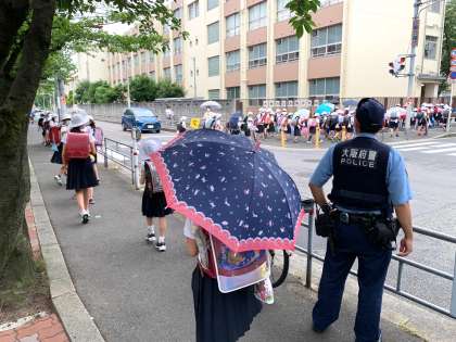 警察官の方も、登校時の見守りに駆け付けてくださいました。
