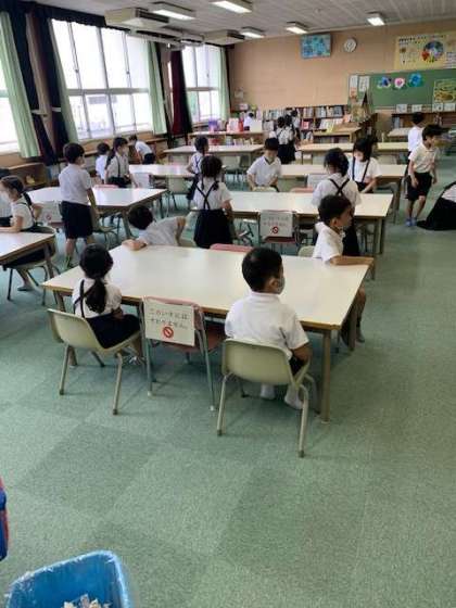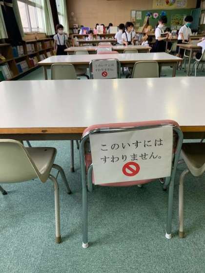一人一人の間隔を空けるために、真ん中にすわりませんの札を貼っています。子どもたちも図書室で静かに本を選び読書します。