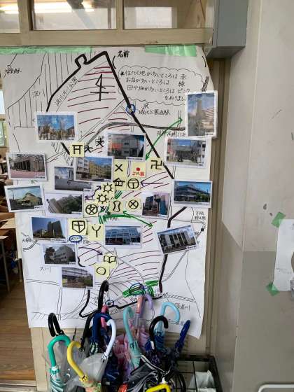 どこに何があるのか、写真と地図記号で大きな紙に表します。