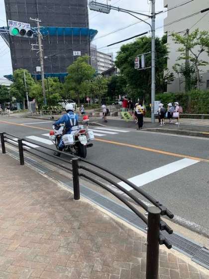 また、今日は警察の方も巡回を強化してくれています。曲がり角に立ったり、白バイが通学路を見回ったりしてくれました。