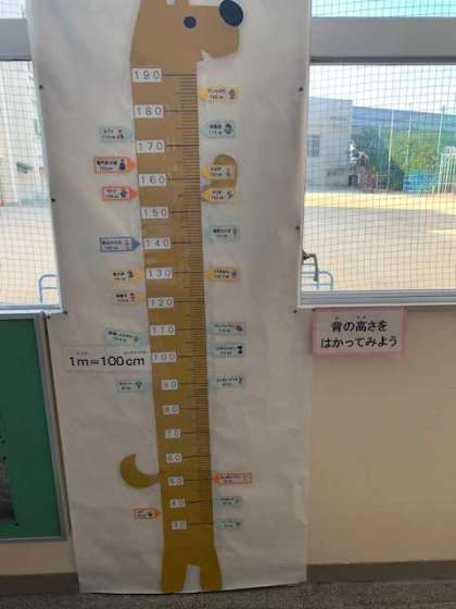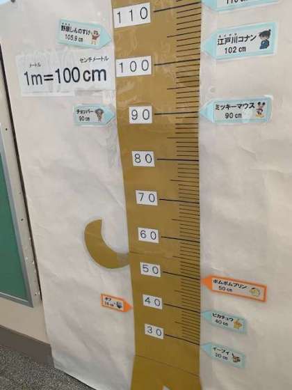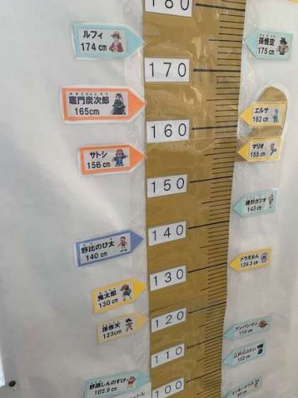 保健室前の掲示物には、有名なキャラクターの身長がどれくらいかを掲示しています。