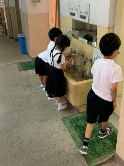 手洗いです。 トイレも済まして、5時間目の授業の準備をします。
