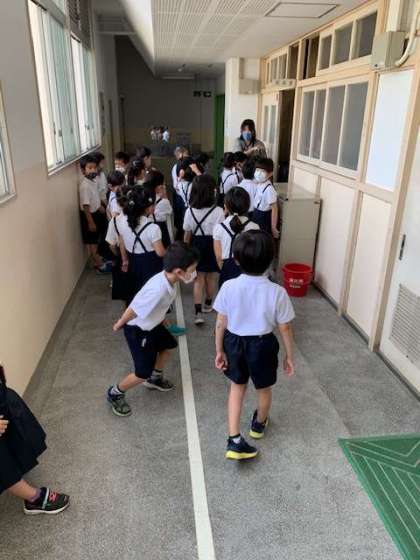 1年生は、各クラスで今分校にどんなお部屋があるのかをたんけんしています。今日来た1年生のクラスでは、校長室の見学をしながらソファーの座り心地も確認です。