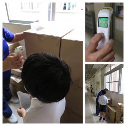 健康観察表を配布し、毎朝の健康観察をお願いしているところですが、検温をせずに登校してきた児童は、非接触方式の体温計で検温しています。