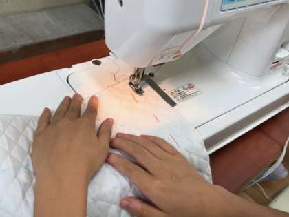 仮縫いをした布にゆっくりと、ていねいにミシン糸を進めていました。