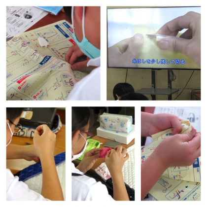 5年生は、【基本的な縫い方の練習】をしており、練習用の布を使って玉結びにチャレンジしていました。糸が余らないようにきっちりと玉結びをするのは難しく、何度もチャレンジしている児童もいました。