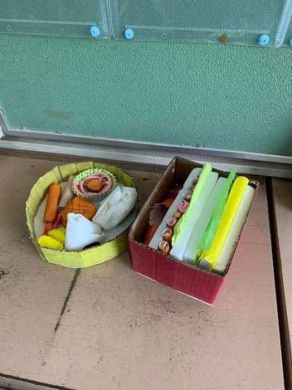 1年生の教室後方ロッカーに、子どもたちが夏休みに作った工作が飾られています。