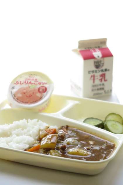 今日の献立は、牛肉と大豆のカレーライス、きゅうりのピクルス、りんごゼリー、牛乳です。