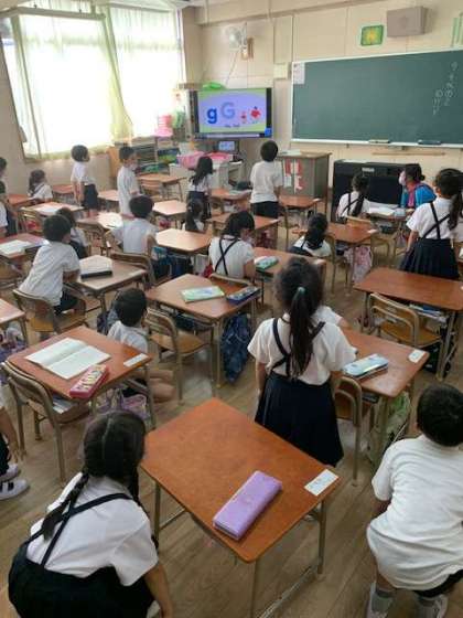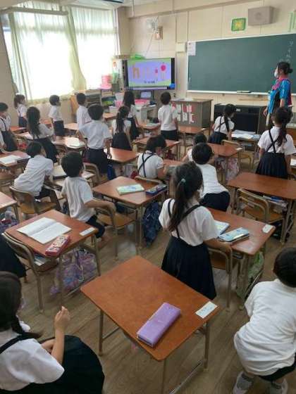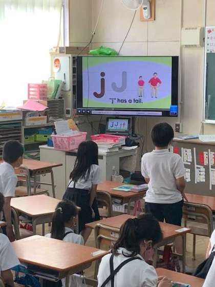アルファベットを言いながら、体も動かします。アルファベットの読み方は、一学期から学んでいるので子どもたちも楽勝の子がほとんどです。