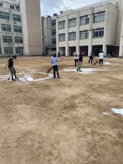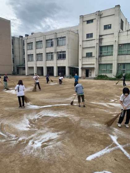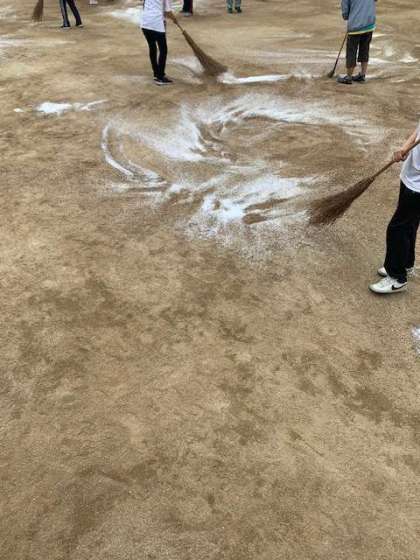 運動場に「にがり」を撒きました。にがりを撒く効果として、「表面を安定させる」「湿度を保つ」の2つがあります。