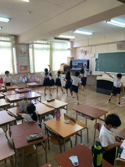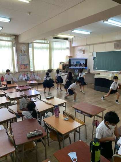 2年生のある教室の休み時間です。準備運動を兼ねたダンスを教室で練習しています。