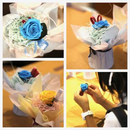 フラワーアレンジメントのコーナーでは、子どもたちが好みの花を選んで飾り付け。向かいのメガネコーナーでは、好きな色のフレームやレンズを選んで自由にデザイン。