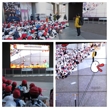 例年ならすぐに入館するのですが、学年を3分割して少しずつ入館します。待ち時間は、テレビ局のモニターが子どもたちを楽しませてくれました。