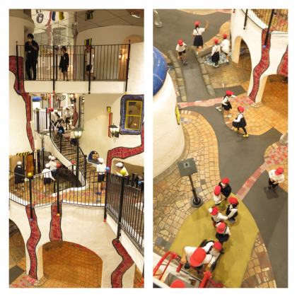 エレベーターを降りて最初に目にする吹き抜けのスペース。滑り台や梯子などのしかけもある立体の迷路です。